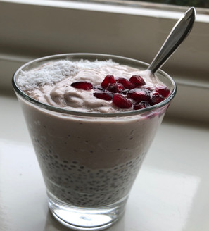 3e: Maak de topping af met van enkele granaatappelpitjes en de kokosrasp.